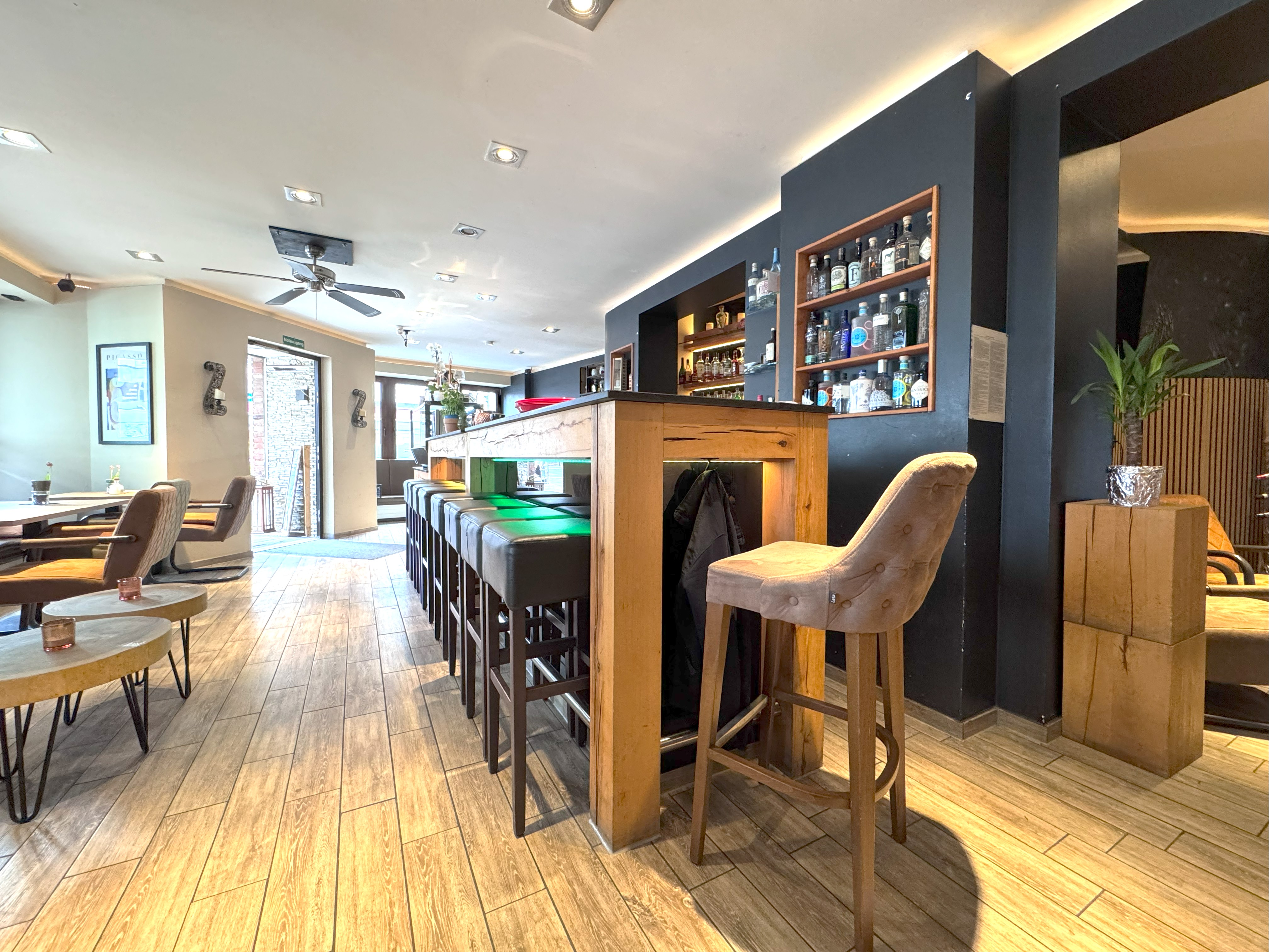 Rechts liegt ein ansprechendes Café/Bistro mit Barbereich auf rund 113 qm. Hier fand in diesem Jahr ein Betreiberwechsel statt, verbunden mit einem neuen Mietvertrag über 5 Jahre plus einer 5-jährigen Verlängerungsoption. Der Betreiber hat das Café sowie die Außenterrasse mit neuem Mobiliar ausgestattet. Die Ausschanklizenz für den Gastronomiebetrieb wurde 2025 auf den neuen Betreiber umgeschrieben.
